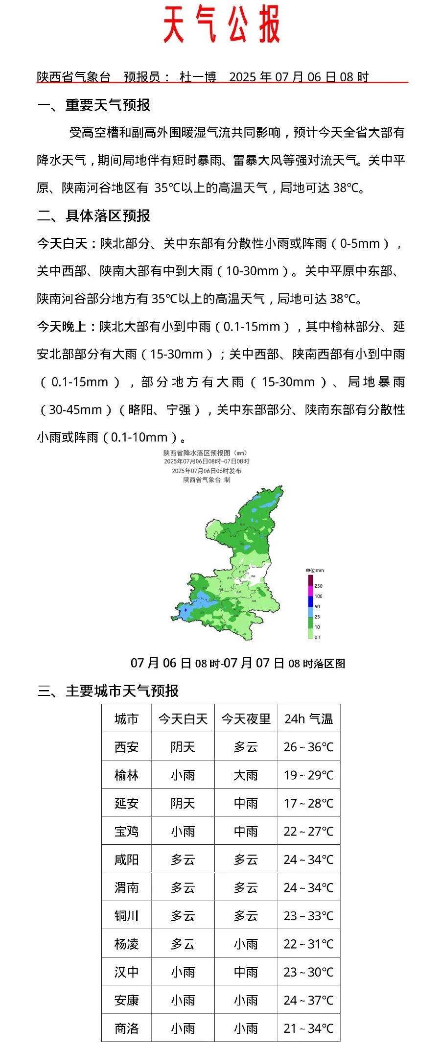 *7日:*陝北大部有小到中雨,其中榆林部分、延安北部部分有大雨;關中部分、陝南東部有分散性小雨或陣雨,關中北部局地中到大雨,秦巴山區、陝南西部有小到中雨,漢中西部部分地方有大雨,局地暴雨。關中平原部分地方有35℃以上的高温天氣。