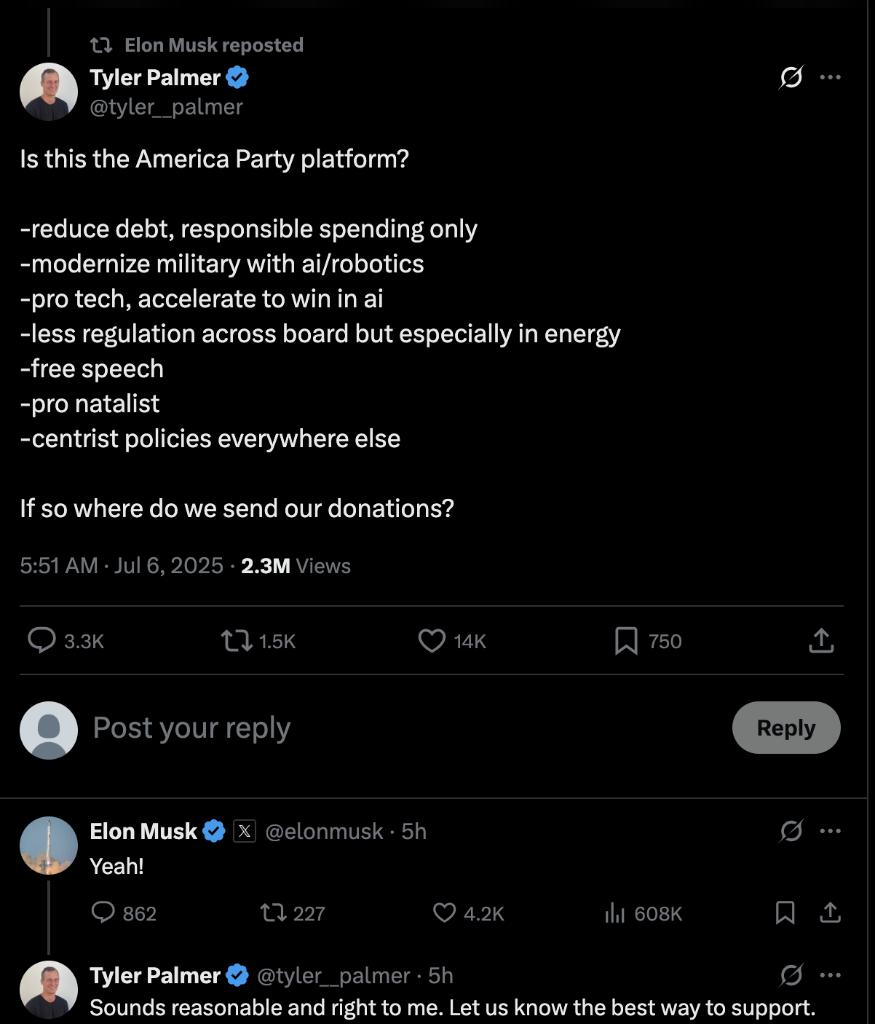 馬斯克回覆有關“美國黨”綱領帖文的截圖。