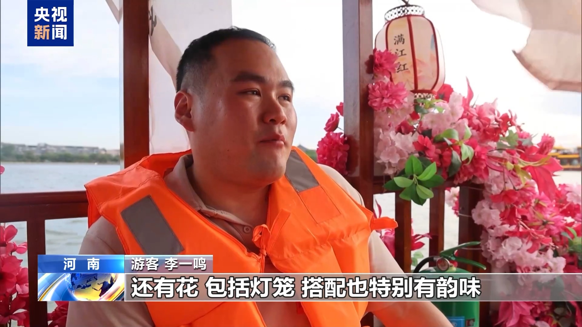 *遊客 李一鳴:*置身於這個歷史古城之中,就像《清明上河圖》裏面的人物一樣。船上裝點的古典詩詞,還有花,包括燈籠,搭配特別有韻味。