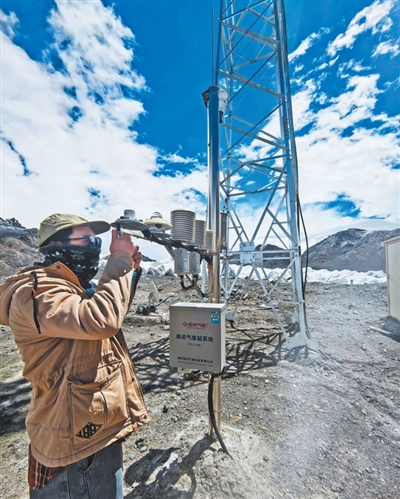 安多縣的氣象裝備保障人員在格拉丹東自動氣象站開展維護保障工作。安多縣氣象局供圖