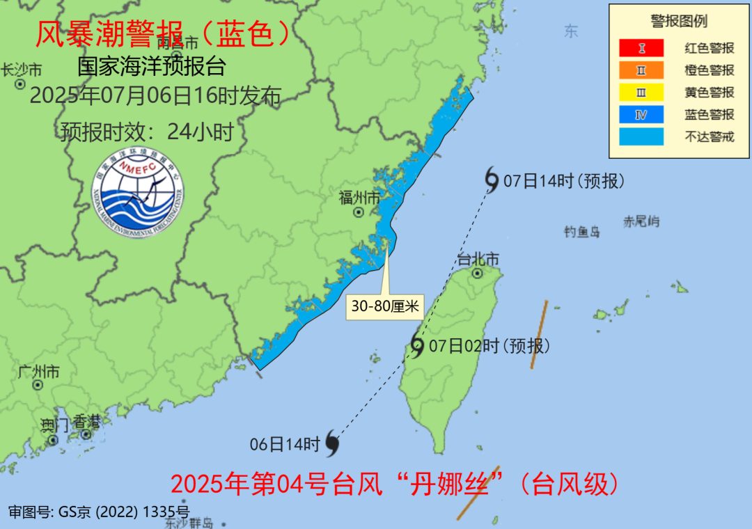 受今年第4號颱風“丹娜絲”的影響,預計7月6日下午至7日下午,福建漳州到浙江温州沿海將會出現30到80釐米的風暴增水。上述岸段內的潮位站將不會出現達到當地藍色警戒潮位的高潮位。風暴潮預警級別為藍色。