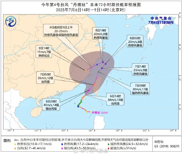 預計颱風“丹娜絲”有可能於6日夜間登陸或擦過台灣島西部一帶沿海,7日早晨移入東海西南部海面,然後逐漸靠近福建北部至浙江中南部一帶沿海。
