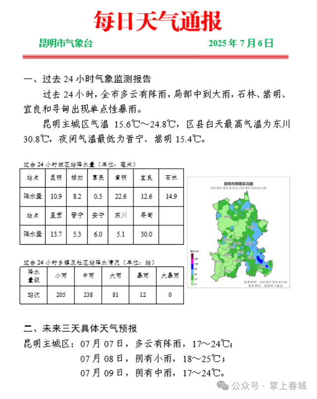 回顧今年上半年,昆明天氣氣候特點顯著。除5至6月的降雨和氣温異常外,還出現了下雪、倒春寒等天氣,雨季開始時間也偏早。目前,昆明正處於主汛期(6至8月),汛期將持續到10月結束。因此,今年全年的降雨是否充沛,仍需關注後續幾個月的降水情況。