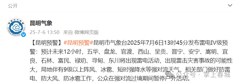 據昆明市氣象台官方微博@昆明氣象 消息,昆明市氣象台2025年7月6日13時45分發佈雷電Ⅳ級預警:預計未來12小時,五華、盤龍、官渡、西山、呈貢、晉寧、安寧、嵩明、宜良、石林、富民、祿勸、尋甸、東川將出現雷電活動,出現雷擊災害事故的可能性大,局地伴有9級以上陣風、冰雹、短時強降水等強對流天氣,相關部門做好防雷電、防大風、防冰雹工作,公眾在強對流過境期間暫停户外活動。