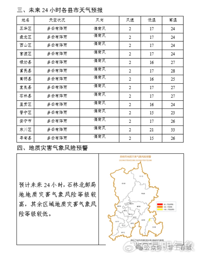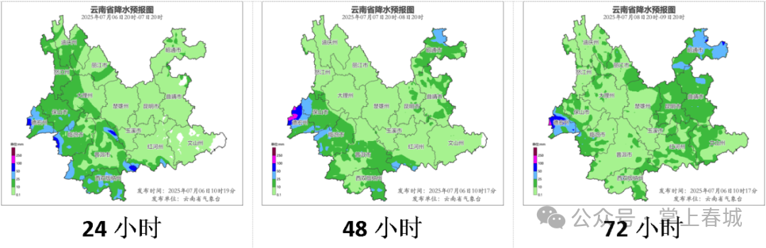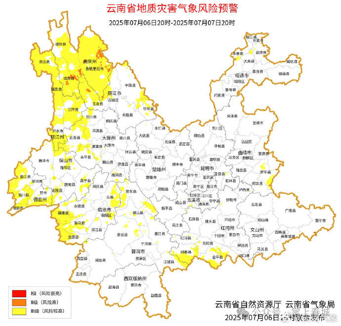 2025年7月6日20:00~7月7日20:00,迪慶州香格里拉市、維西縣、德欽縣,麗江市玉龍縣,臨滄市鎮康縣、耿馬縣,怒江州福貢縣發生滑坡泥石流的風險高;迪慶州大部,怒江州大部,德宏州大部,臨滄市北部至中部、南部,麗江市西部至中部、東部,大理州北部、西部和南部,保山市北部、南部和東部,普洱市北部、南部,紅河州南部、東北部,曲靖市南部,昭通市北部,玉溪市中部、西部,昆明市東南部發生滑坡泥石流的風險較高。