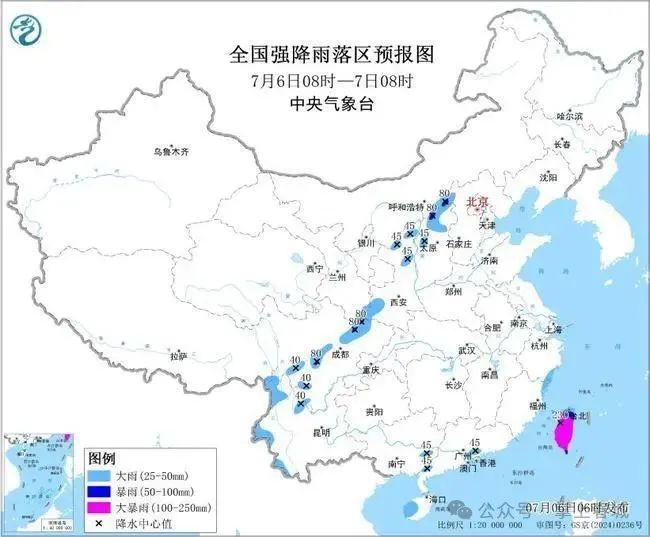 預計,7月6日8時至7日8時,台灣島、廣東西南部、廣西東南部、海南島西部、內蒙古南部、山西北部、陝西北部和西南部、四川盆地西北部、川西高原南部、雲南中西部等地部分地區有大到暴雨,其中,台灣島中南部有大暴雨(100~230毫米)。上述部分地區伴有短時強降水(最大小時降雨量20~50毫米,局地可超過70毫米),局地有雷暴大風等強對流天氣。