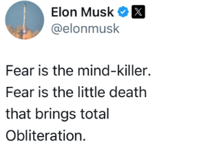 此外,另一名美國博主就特朗普的帖文評論説:“他(特朗普)害怕了。”馬斯克回覆説:“恐懼是思維殺手。恐懼是帶來徹底毀滅的小小死神。”這是美國小説家弗蘭克·赫伯特的經典科幻小説《沙丘》中的著名台詞。
