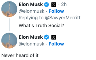 特朗普在“真實社交”上所發帖文很快被截圖轉引到社交媒體X上,一名博主在轉引時配文稱:“特朗普剛剛就埃隆·馬斯克在‘真實社交’上發帖。” 馬斯克則在這則轉帖下留言稱:“什麼‘真實社交’,沒聽説過。”美國《野獸日報》稱,馬斯克疑似是在嘲諷特朗普。