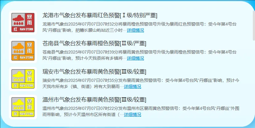 截至7日上午7時,温州多地發佈暴雨預警,其中,龍港發佈紅色暴雨預警。