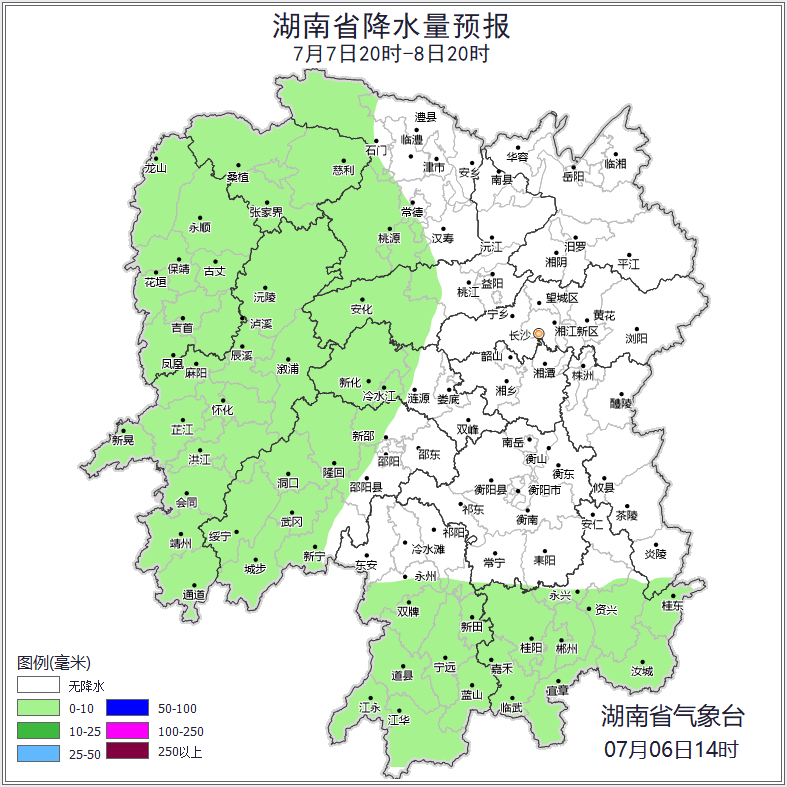 7 日晚上至8日白天 ,晴天間多雲,湘西、湘南有陣雨或雷陣雨;南風2~3級,雷雨時局地陣風7~9級;最高氣温36~39℃,最低氣温25~29℃。