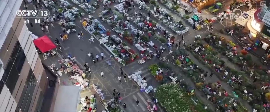 伴隨着夜幕降臨,除了白天部分固定攤位的攤主開始營業,許多來自周邊地區的花農和鮮花商户也爭先恐後拉着小推車,滿載着鮮切花進入市場。“走播帶貨”的鮮花電商主播頭戴花環,手捧鮮花的市民遊客也緊跟其後、絡繹不絕。整個市場鋪滿了鮮花,走進其中芳香撲鼻。