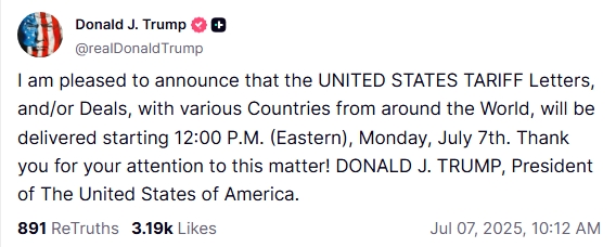 特朗普6日在社交媒體“真實社交”上説:“我很高興地宣佈,美國將於7月7日,星期一,中午12時(美東時間)開始向各國遞送關税信函或協議。”