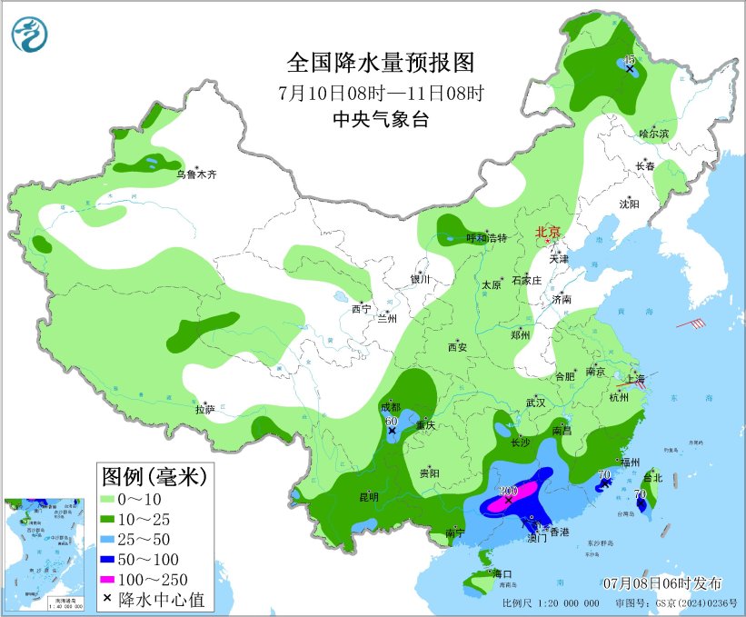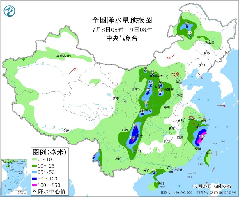 預計,7月8日08時至9日08時,浙江中南部和東部、福建東北部、四川東部、重慶西部、貴州西北部、內蒙古東北部、陝西大部、山西中部、雲南西北部等地部分地區有大到暴雨,其中,浙江東南部、福建東北部、四川東部等地部分地區有大暴雨(100~230毫米)。上述部分地區伴有短時強降水(最大小時降雨量20~50毫米,局地可超過70毫米),局地有雷暴大風等強對流天氣。中央氣象台7月8日06時繼續發佈暴雨黃色預警*。*