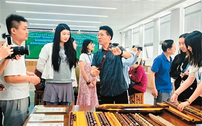在玉屏簫笛工匠坊,學校教師王展才向大家介紹樂器。