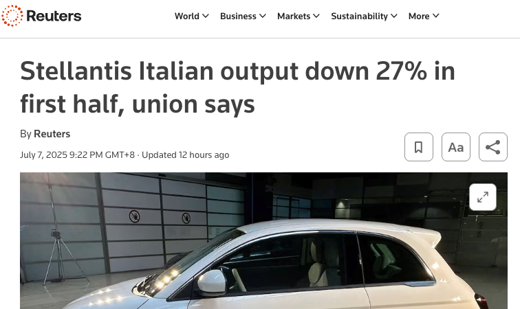 進入2025年,頹勢未止。一季度,Stellantis在意大利的汽車產量同比下降35.5%,僅約11萬輛;二季度雖未公佈具體數據,但工會稱“降幅與一季度持平”。烏利亞諾警告:“新車型要到2026年才能量產,2025年全年產量可能不足25萬輛,較2024年再降48%。”