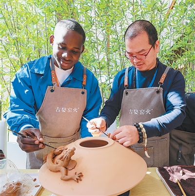 2024年11月8日,2024中非經貿和文化論壇活動現場,非洲學者在體驗浙江金華婺州窯傳統技藝。