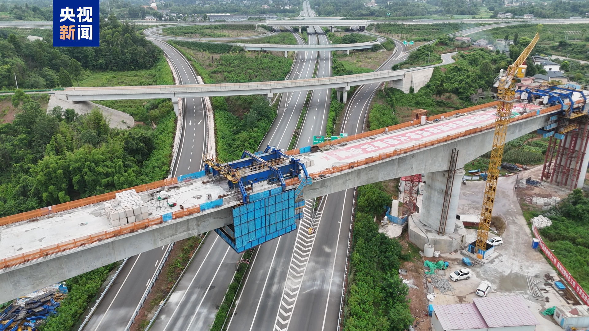 土橋樞紐互通雙線特大橋全長3271.6米,上跨重慶三環高速及銅安高速公路,共設有92個橋墩,2個橋台。此次合龍的連續梁,全長約242米,成功跨越重慶三環高速公路,為成渝中線重慶段跨度最大連續梁。施工過程中,施工方中鐵五局在此前使用的4米智能懸臂造橋機基礎上,進一步優化設計,應用了6米智能懸臂造橋機,該造橋機單次澆築節段更長,安裝、拆除更為便捷,結構更加安全穩定,較傳統掛籃4米節段施工,綜合工效提升30%以上。同時,應用了造橋機信息化監測、自動行走、模板自動開合、自動噴淋養護等智能化設備,顯著提升了連續梁智能建造水平。