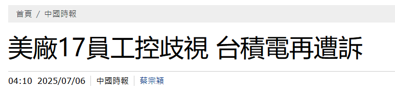 據報道,近日有17名原告對台積電提起集體訴訟,並提交了超過160頁的指控。一名為台積電人力資部門工作的加州女性表示,台積電偏好台灣地區與中國大陸員工。多位原告聲稱,他們遭遇帶有敵意的工作環境,台積電趕走美國員工,並以外籍工人取代。