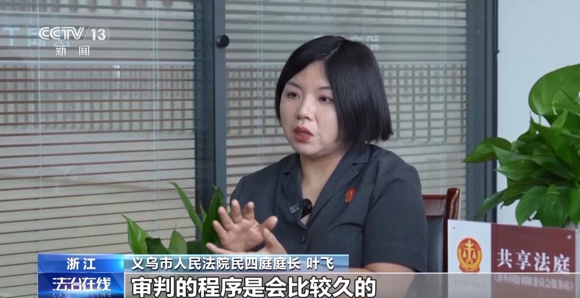 義烏市人民法院民四庭庭長 葉飛*:*因為涉及外商,涉及外國人,我們的送達流程,相對普通的國內民商事案件來説,審判的程序是會比較久的,所以我也跟原告説了,我説你的目的其實是拿到貨款,在被告方現在也有調解意向的情況下,我們不妨把這個案子先走調解的流程。