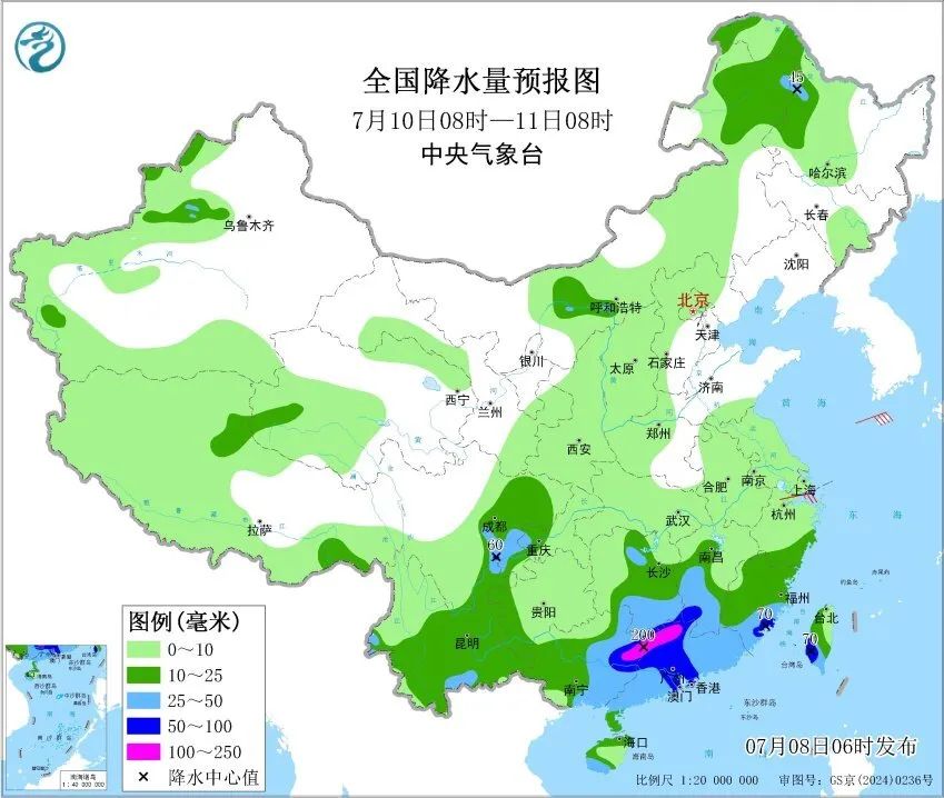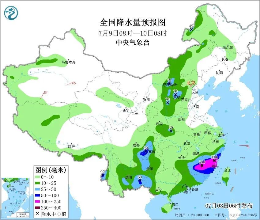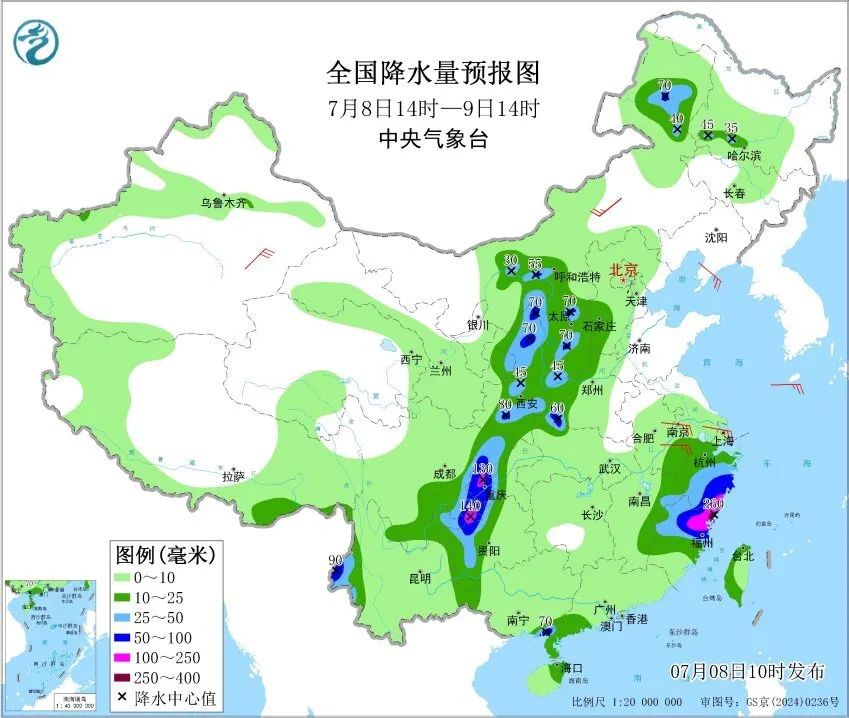 預計,7月8日14時至9日14時,浙江中南部和東部、福建北部、四川東部、重慶西部、貴州西部、黑龍江西南部、內蒙古河套地區和東北部、陝西大部、山西中南部、河南西部、湖北西北部、雲南西部等地的部分地區有大到暴雨,其中,浙江東南部、福建東北部、重慶西部、四川東南部、貴州西北部等地的部分地區有大暴雨,局地特大暴雨。上述部分地區伴有短時強降水,局地有雷暴大風等強對流天氣。
