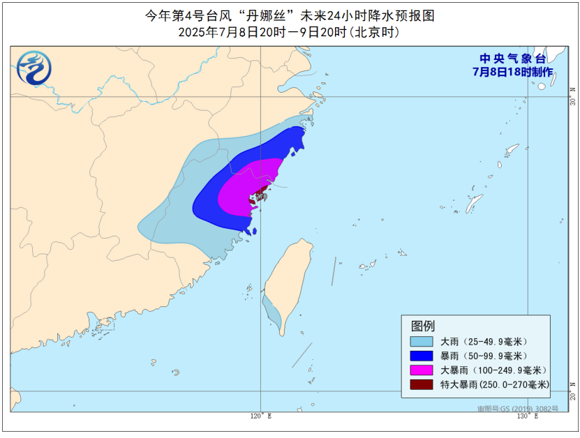 其中,浙江東南部、福建東北部等地的部分地區有大暴雨,局地特大暴雨(250~270毫米)。