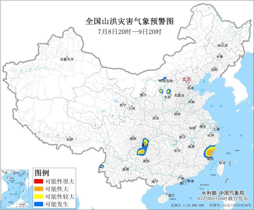 水利部和中國氣象局7月8日18時聯合發佈橙色山洪災害氣象預警