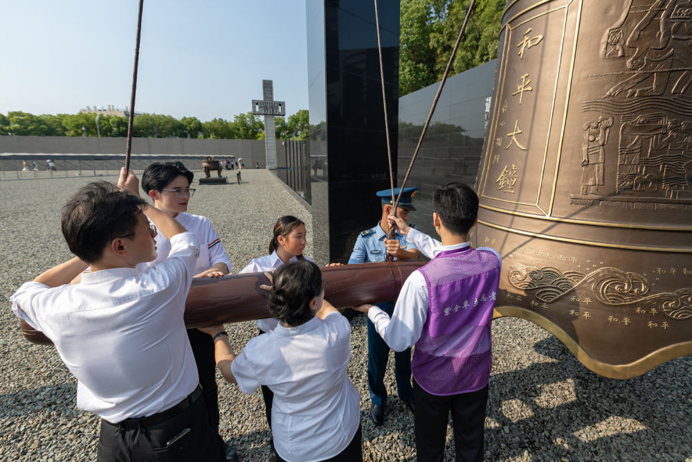 7月7日,各界人士代表在“紀念全民族抗戰爆發88週年”儀式現場撞響和平大鐘。新華社發(胡瀟攝)