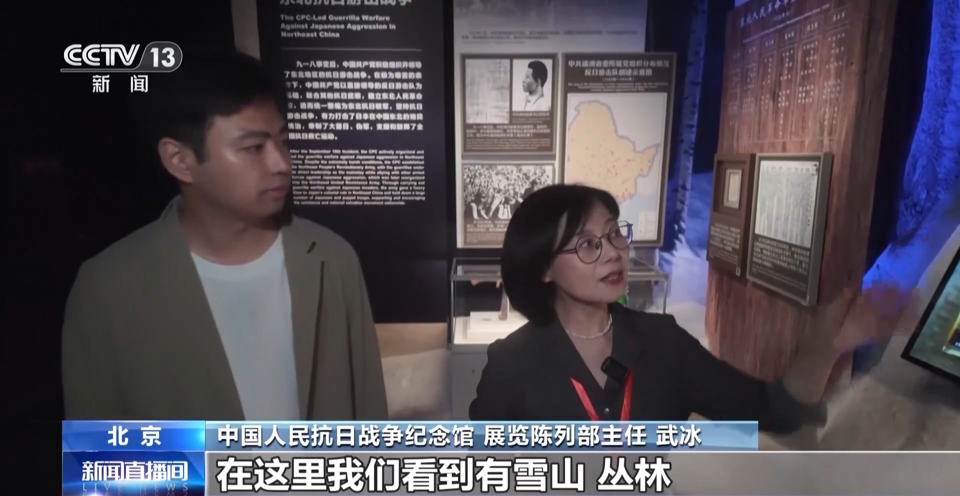 *中國人民抗日戰爭紀念館 展覽陳列部主任 武冰:*現在我們來到的這個空間就是東北抗聯,在這裏我們看到有雪山、叢林,在這裏還增加了松樹的樹種,圖片、文物全部放置在了雪山當中。觀眾在行進過程當中,會有一種破雪前行、歷史畫面慢慢地呈現出來的感受。像這樣的綜合性的景觀打造,在整個展覽當中大概有十餘處。