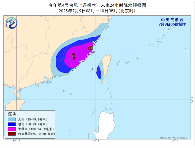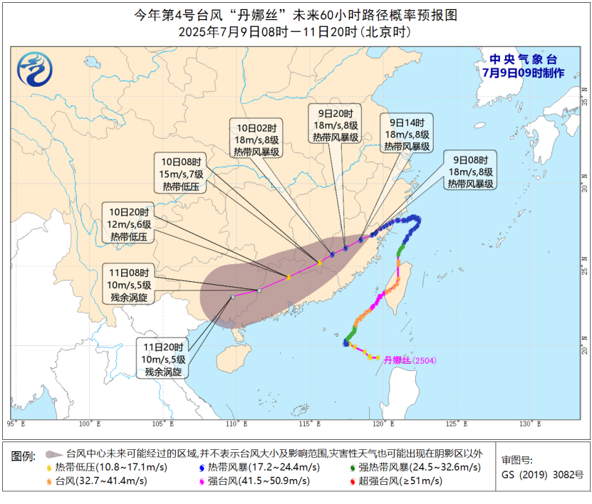 預計今天,“丹娜絲”將以每小時15~20公里的速度向西偏南方向移動,強度緩慢減弱。7月9日08時至10日08時,東海西南部、台灣海峽、巴士海峽、台灣東南部海面、南海大部以及浙江南部沿海、福建沿海、台灣島北部沿海、廣東東部沿海將有6~7級大風,陣風8~9級。