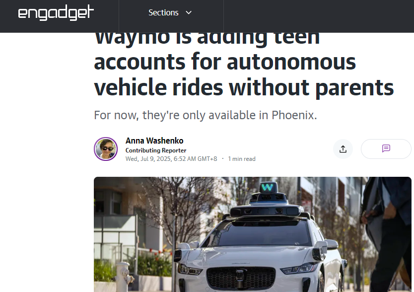 【環球網科技綜合報道】據外媒7月9日消息,美國自動駕駛企業Waymo近日宣佈,在亞利桑那州鳳凰城推出針對14至17歲青少年的獨立乘車服務,成為全球首個允許未成年人單獨使用全無人駕駛出租車的企業。
