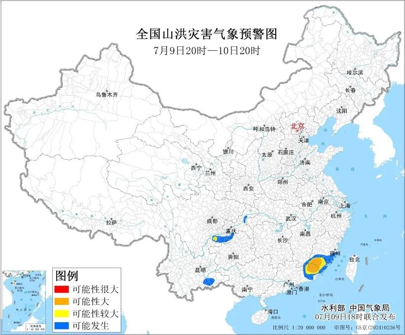 預計,7月9日20時至10日20時,福建南部、江西東南部、廣東東部、四川東南部、雲南東北部等地部分地區發生山洪災害可能性較大(黃色預警),其中,福建南部、江西東南部、廣東東部等地部分地區發生山洪災害可能性大(橙色預警)。其他地區也可能因局地短歷時強降水引發山洪災害,請各地注意做好即時監測、防汛預警和轉移避險等防範工作。