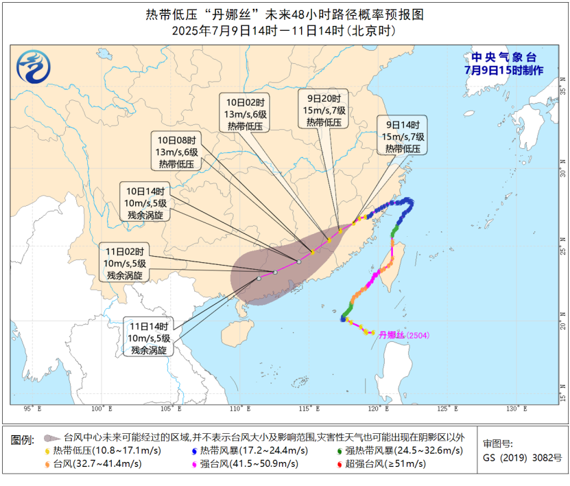 9日14時,“丹娜絲”減弱後的熱帶低壓中心位於福建省南平市延平區境內,未來將以每小時15至20公里的速度向西偏南方向移動,強度繼續減弱。受“丹娜絲”殘餘環流和西南季風共同影響,9日下午至12日,江南、華南和貴州等地部分地區將有強降雨。