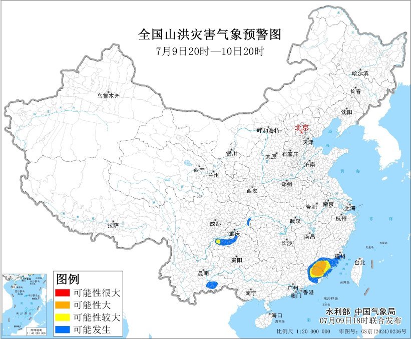 預計,7月9日20時至10日20時,福建南部、江西東南部、廣東東部、四川東南部、雲南東北部等地部分地區發生山洪災害可能性較大(黃色預警),其中,福建南部、江西東南部、廣東東部等地部分地區發生山洪災害可能性大(橙色預警)。