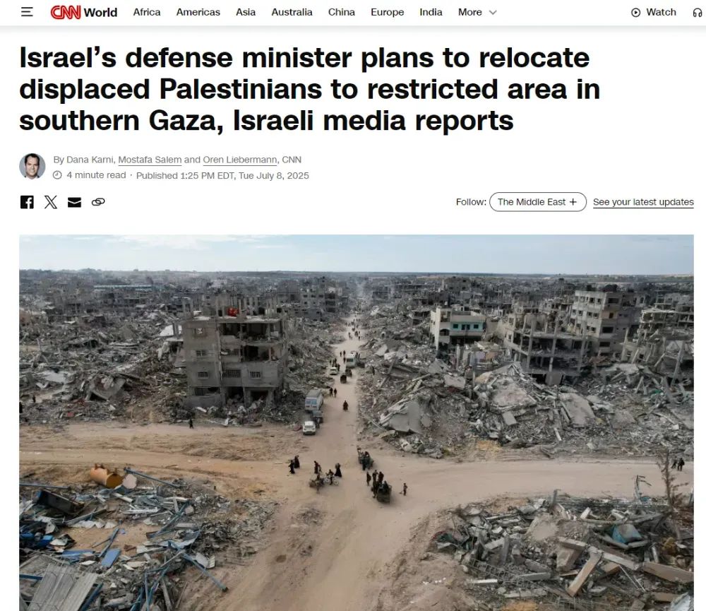 以色列《國土報》7日報道稱,卡茨在6日曾稱以軍對加沙的軍事行動不涉及加沙地帶的“人口集中轉移”,卻在次日拋出所謂“人道主義城”的計劃,兩個表態自相矛盾。在該報道的評論區,不少讀者稱卡茨此舉就是設立針對巴勒斯坦人的集中營。