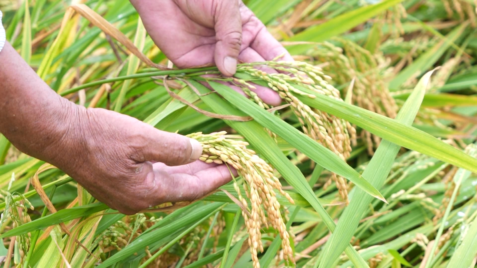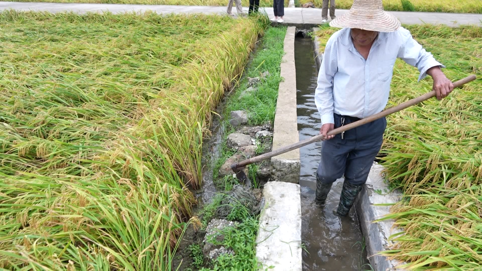 農技專家楊煥清來到現場指導農户搶收,“它倒平後很容易會發芽,稻穀發芽以後就沒有價值了。現在主要就是開溝排水,一有晴天馬上搶收。”