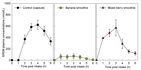 攝入黃烷醇膠囊和混合於不同水果奶昔中後血漿中相關代謝物濃度變化(圖片來源:參考文獻[1])