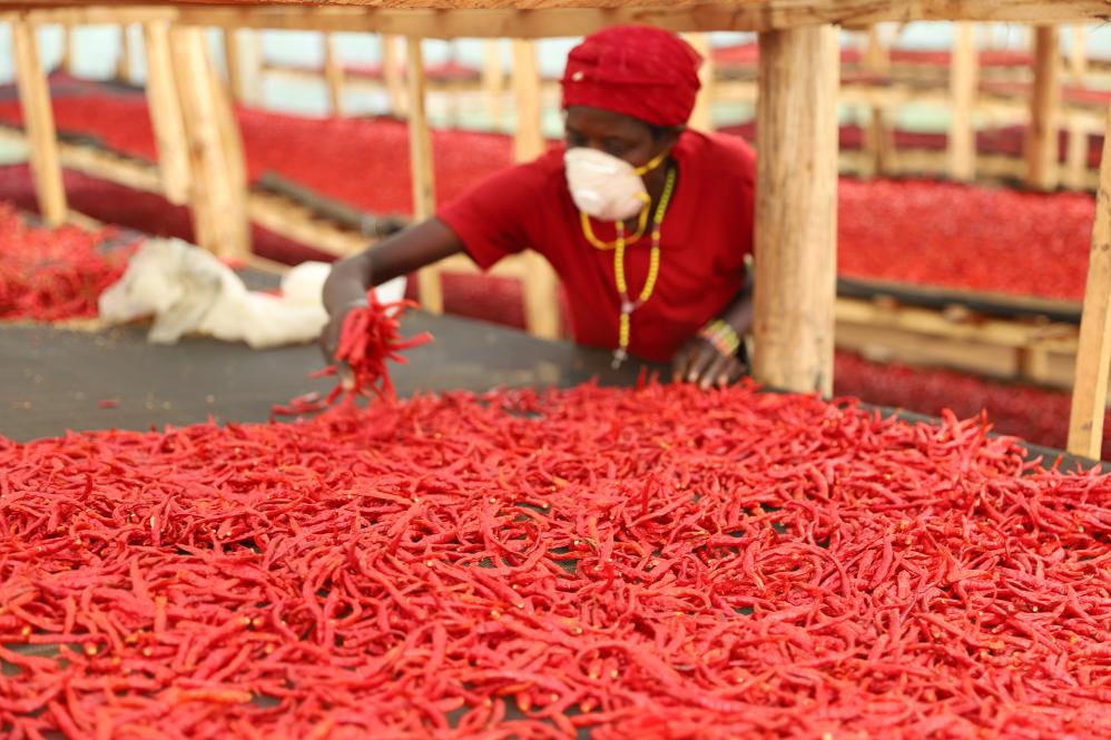 5月22日,工人在盧旺達東方省恩亞加塔雷地區篩選辣椒。(圖片來源:新華社)