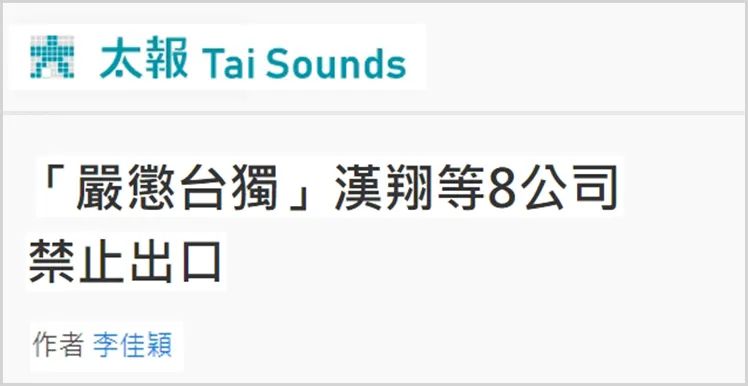 7月9日上午9點,商務部網站發佈了一則重磅公告:根據《中華人民共和國出口管制法》和《中華人民共和國兩用物項出口管制條例》等法律法規有關規定,為維護國家安全和利益,履行防擴散等國際義務,決定將漢翔航空工業股份有限公司等8家台灣地區實體列入出口管制管控名單,禁止對其出口兩用物項。半小時後,國台辦由發言人陳斌華髮聲對商務部的決定表示“強烈支持”,強調這是捍衞國家主權和領土完整、維護台海和平穩定的必要舉措,也是對“台獨”分裂勢力一再進行謀“獨”挑釁的嚴正警告。