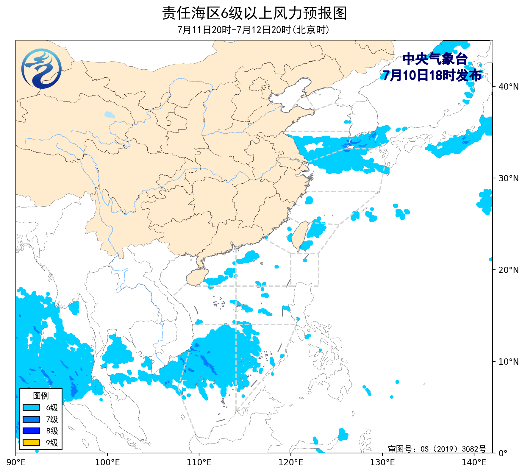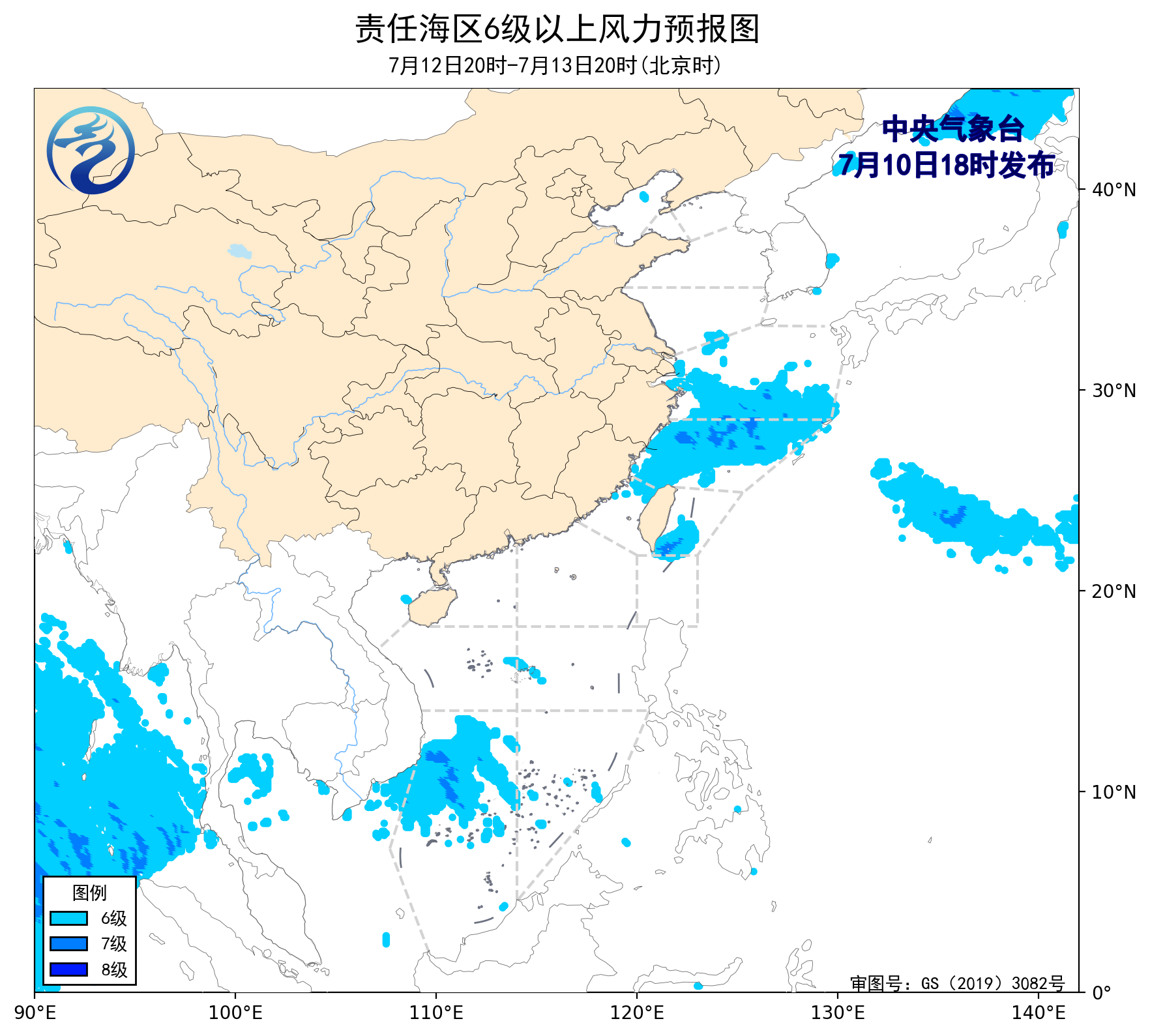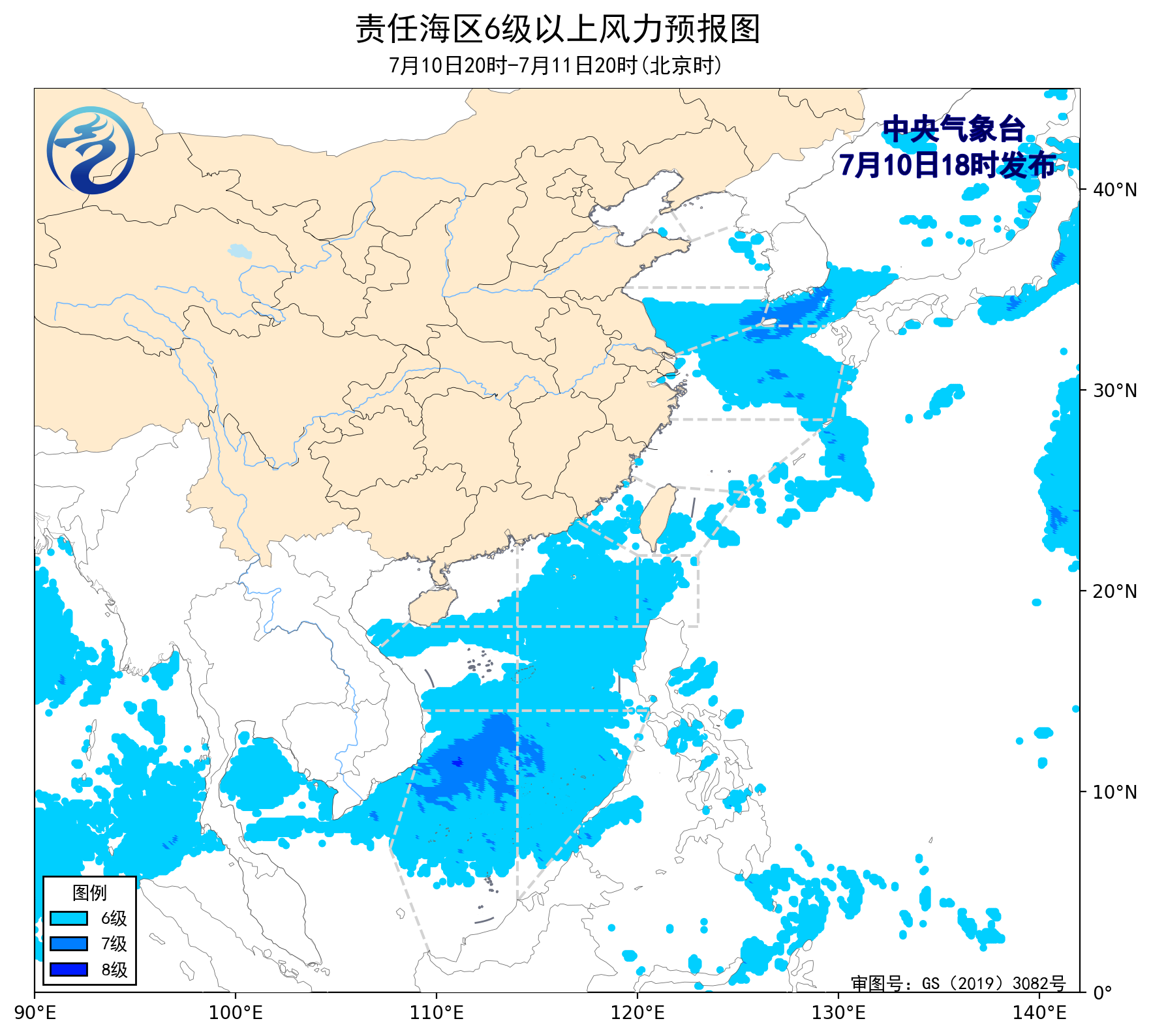 7月10日02時至14時,黃海南部海域、東海大部海域出現了5~7級、陣風8級的偏東風,台灣海峽出現了5~6級、陣風7級的西北風,巴士海峽、南海東北部海域、南海中西部和南部海域出現了5~6級、陣風7級的西南風。黃海中部海域出現了能見度不足1公里的大霧。
