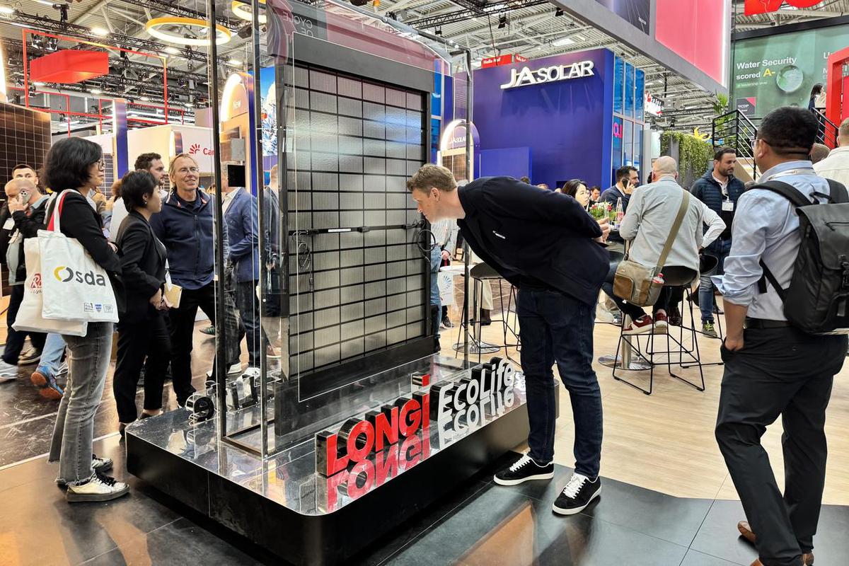 5月8日,參觀者在德國慕尼黑舉行的2025年歐洲國際太陽能展上參觀隆基綠能展區。(圖片來源:新華社)