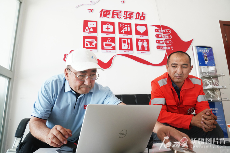 7月1日,在喀什公路事業發展中心疏附養護所蓋孜養護站,記者馬晉軒(左)和王永飛利用午餐時間準備稿件。