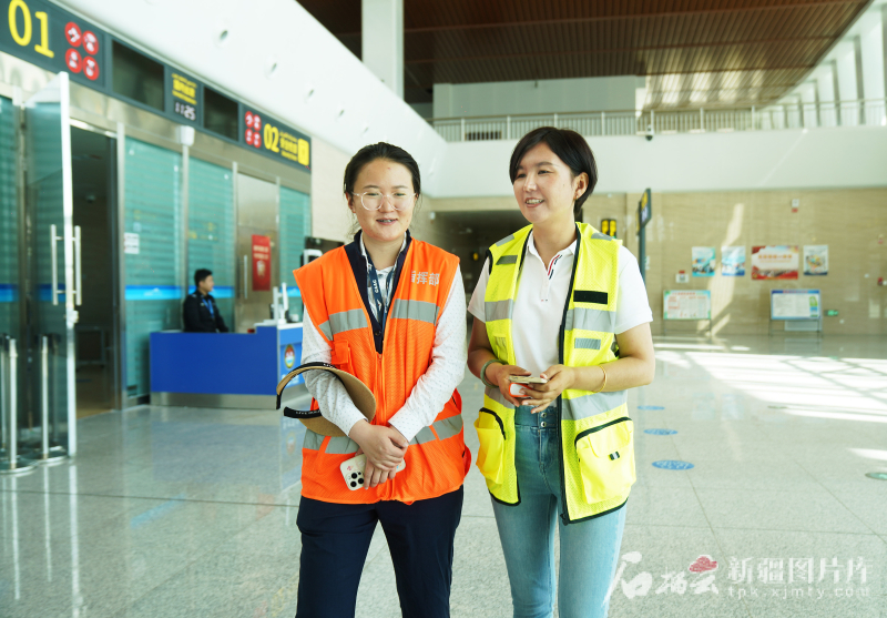 7月4日,記者加孜拉·泥斯拜克(右)在採訪塔什庫爾乾紅其拉甫機場開通後的變化。
