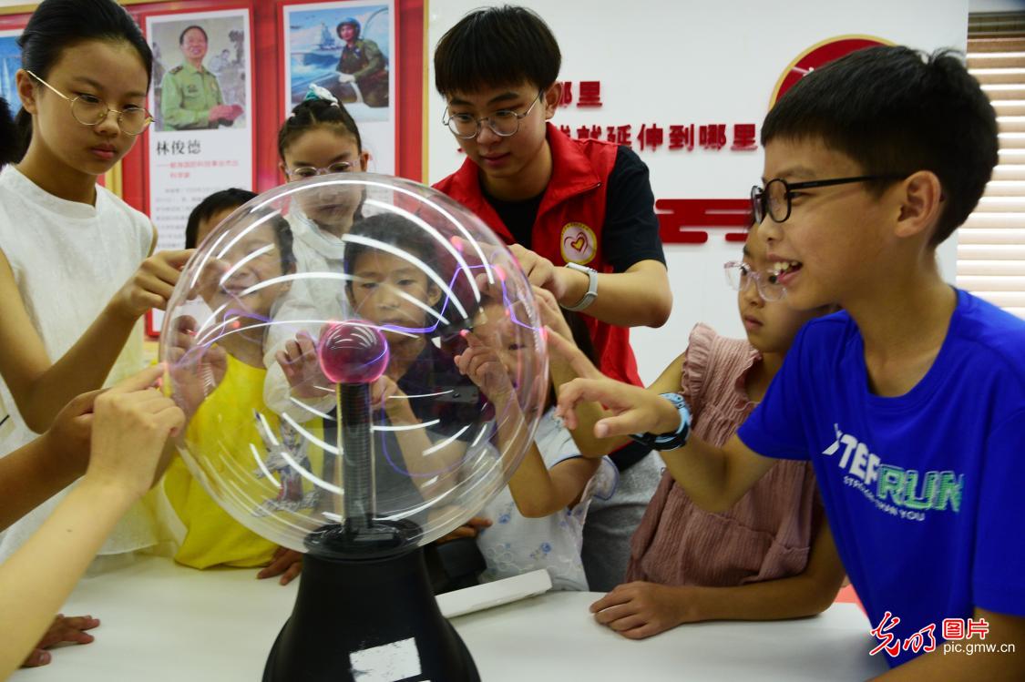 7月10日,在江蘇省鎮江市遠洋社區,江蘇大學志願者指導小朋友體驗“輝光球”的功能。當日,遠洋社區聯合江蘇大學志願者開展“學趣味科普度快樂暑假”活動,指導小朋友體驗各種趣味物理科普實驗和遊戲,感受科技魅力。(石玉成攝/光明圖片)