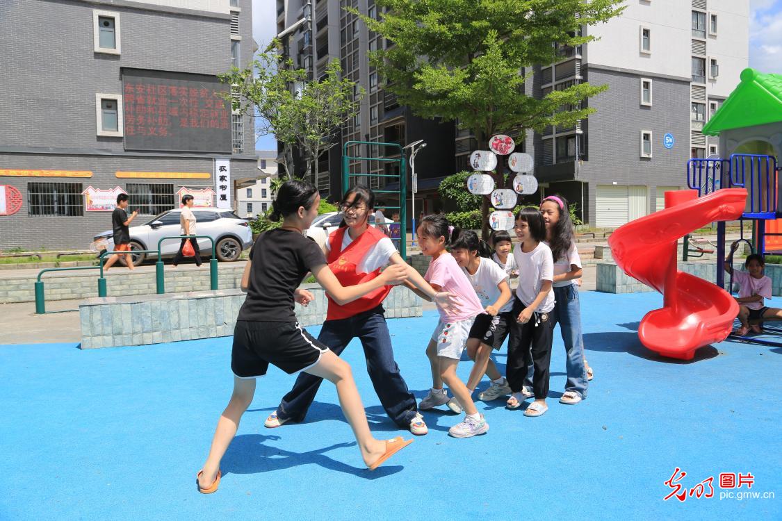 在廣西梧州市蒼梧縣石橋鎮東安社區農家書屋,小朋友們正與大學生志願者一起玩老鷹捉小雞遊戲。在暑期公益託管班,小朋友在大學生志願者的指導下寫作業、上安全課、看書、玩遊戲,開心過暑假。(黎傑源攝/光明圖片)