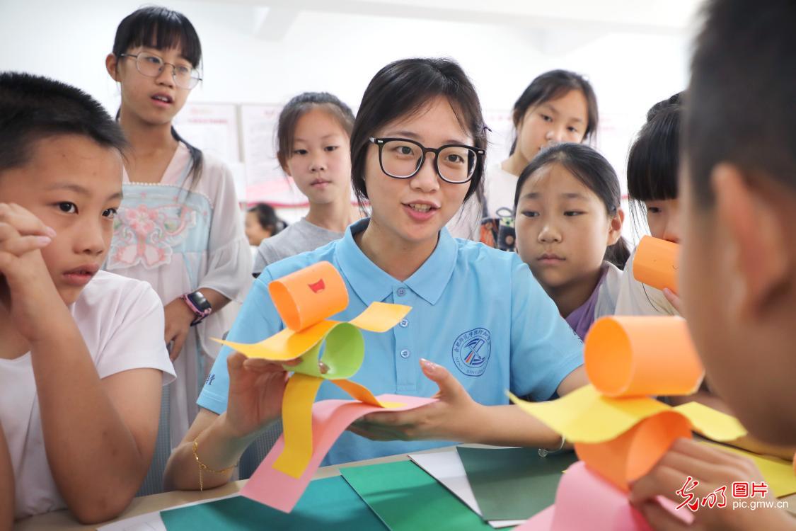 在安徽省六安市金安區望城街道正陽社區,來自合肥師範學院音樂學院的大學生劉雁在教小朋友們做手工。在正陽社區,來自合肥師範學院的12名大學生志願者為孩子們提供思政教育、作業輔導、文體娛樂、興趣培育等公益支教服務,讓孩子們在快樂中求知成長。(田凱平攝/光明圖片)