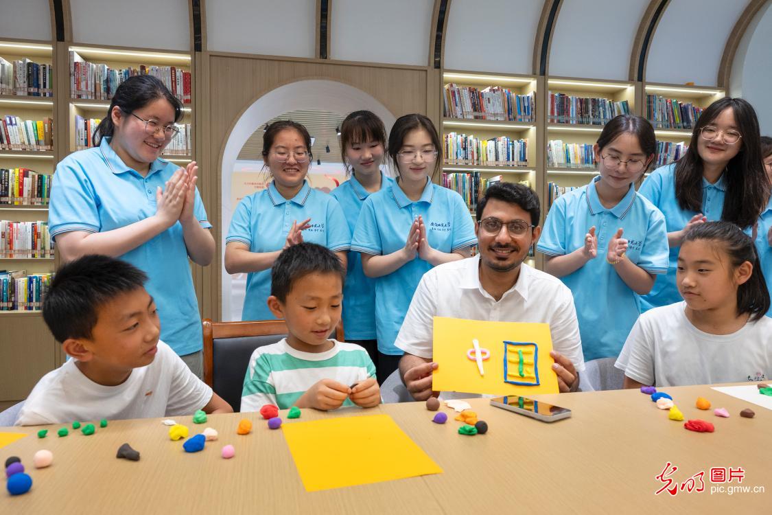 在安徽省蕪湖市繁昌區孫村鎮中分村,安徽師範大學巴基斯坦籍國際大學生(前左三)在展示和暑託班的孩子一起做的手工作品。通過互動遊戲,中外青年以寓教於樂的方式激發兒童創造力。(肖本祥攝/光明圖片)