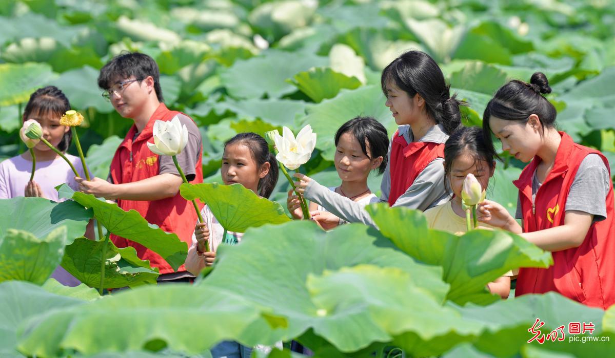 在江蘇省海安市墩頭鎮千步村,南京工業大學建築學院暑期支教大學生志願者在淺水藕田邊教小學生認識荷花、蓮蓬,講解蓮藕生長知識。通過“田間課堂”,大學生志願者們教孩子們認知農作物,體驗農事勞動,豐富假期生活。(周強攝/光明圖片)