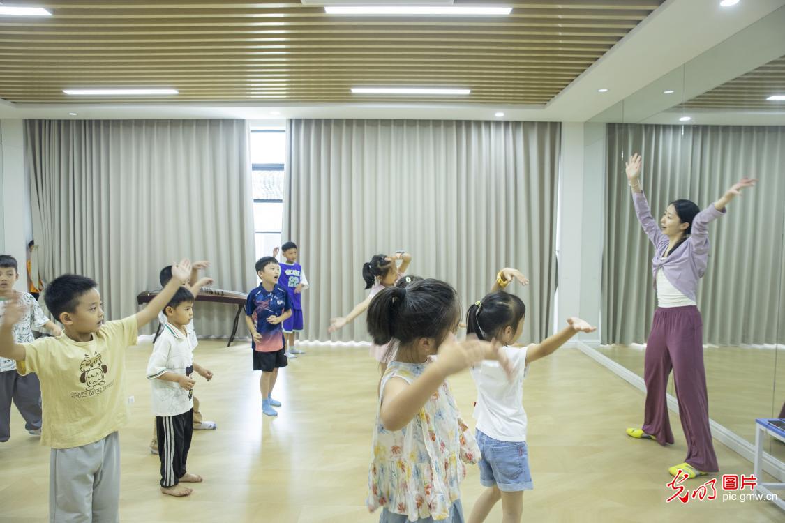 在江西省共青城市未成年人救助保護中心的暑期託管班,孩子們在大學生志願者的悉心陪伴與輔導下,積極參與舞蹈、口才、暑假作業輔導等各類課程,開啓了一段充實而有趣的暑期時光。(潘成攝/光明圖片)