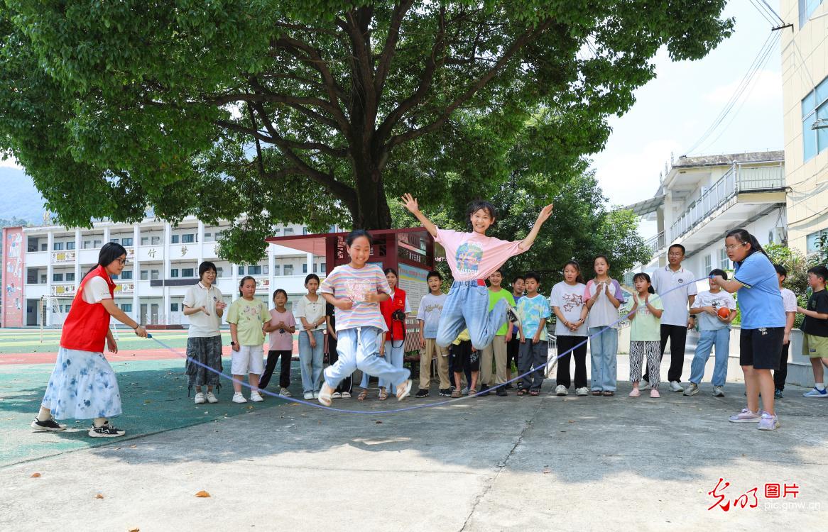 在江西省瑞昌市南義鎮中心小學,來自南昌大學的大學生志願者們與孩子們一起玩跳繩遊戲。暑假期間,大學生志願者與孩子們一起學習、共同娛樂,讓孩子們開心、家長們放心。(魏東昇攝/光明圖片)