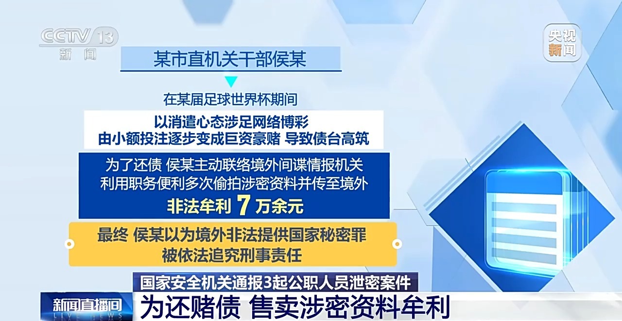 某市直機關幹部侯某,在某屆足球世界盃期間,以消遣心態涉足網絡博彩,由小額投注逐步變成巨資豪賭,導致債台高築。為了還債,侯某主動聯絡境外間諜情報機關,利用職務便利多次偷拍涉密資料並傳至境外,非法牟利7萬餘元。最終,侯某以為境外非法提供國家秘密罪被依法追究刑事責任。